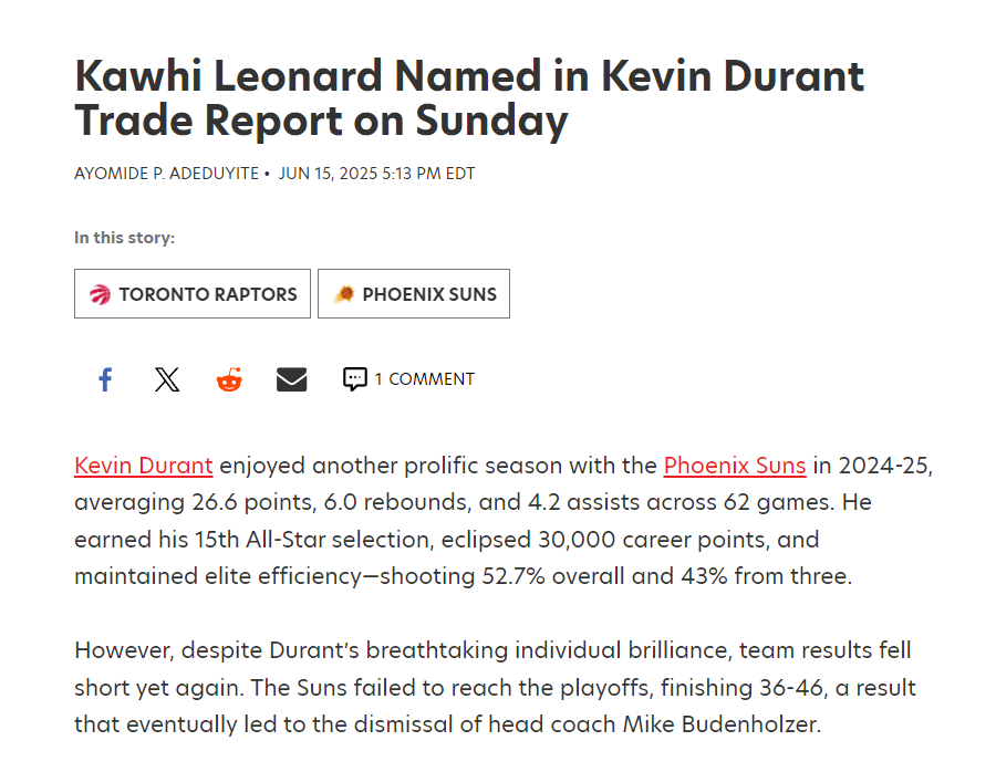 实际上在10多个小时之前,美国媒体速龙体育爆料,洛杉矶快船队球星科怀-伦纳德出现在了杜兰特的交易谈判中。但并没有透露太阳、快船的交易谈判进展到哪一步,毕竟KD与多支球队都传出绯闻。