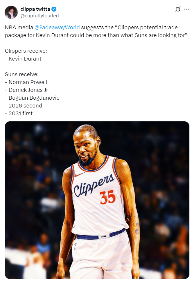 快船媒体还是不愿意送走伦纳德,他们希望快船用鲍威尔、德里克-琼斯、博格丹诺维奇、2026年次轮签、2031年首轮签换来杜兰特,这样可以保留伦纳德组成三巨头。